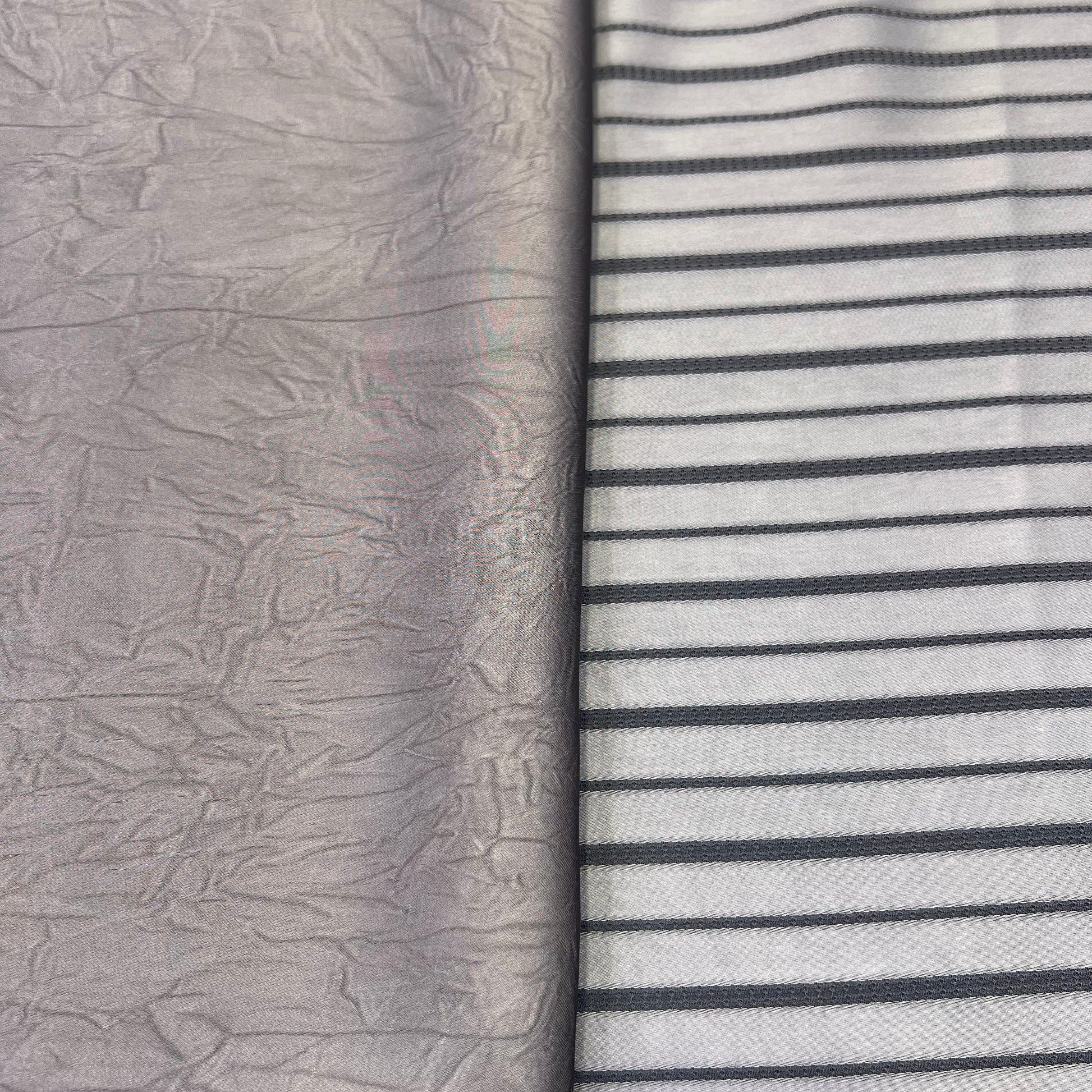 Le tissu offre une texture douce, fluide et légèrement satinée, avec des rayures verticales qui allongent la silhouette et ajoutent une note de sophistication.