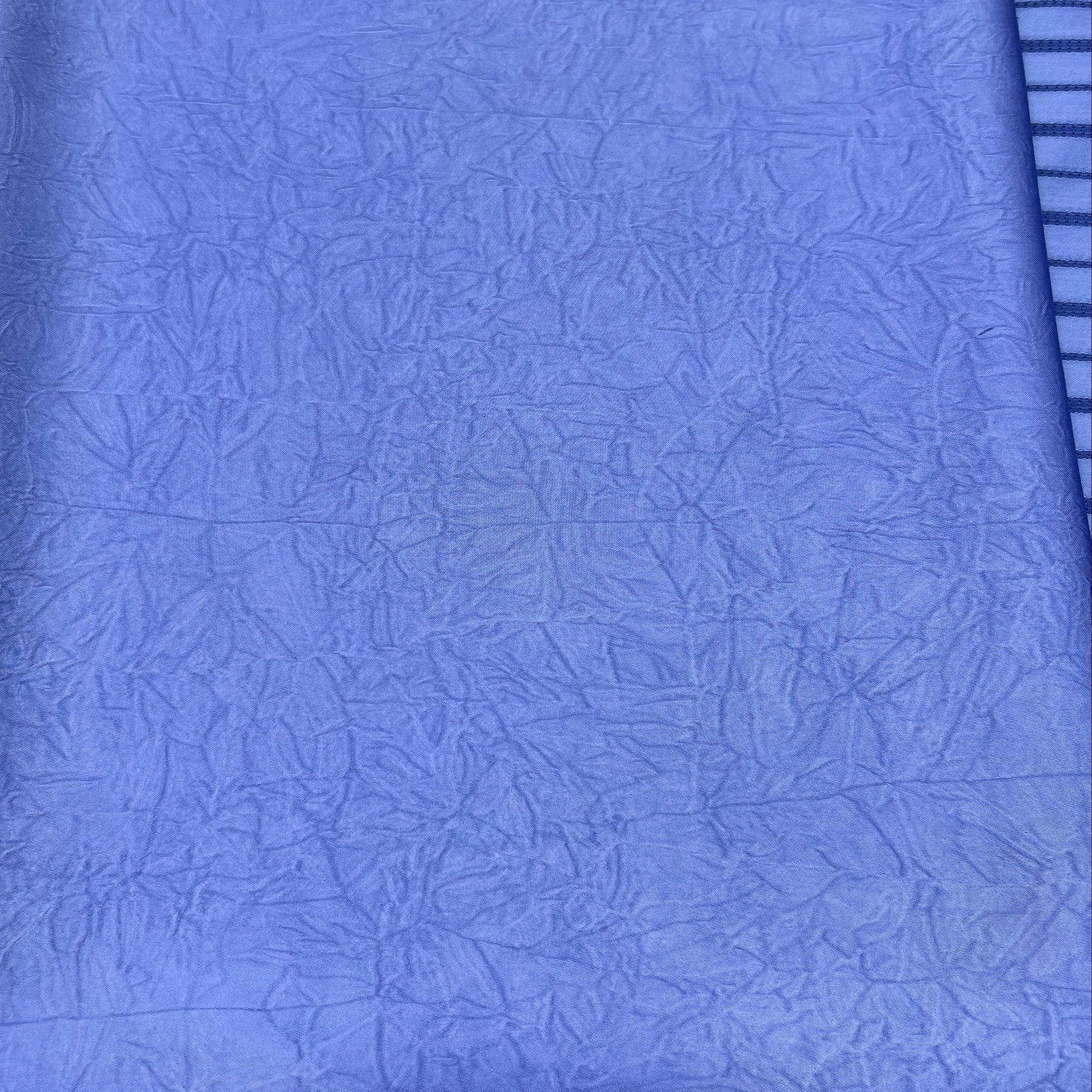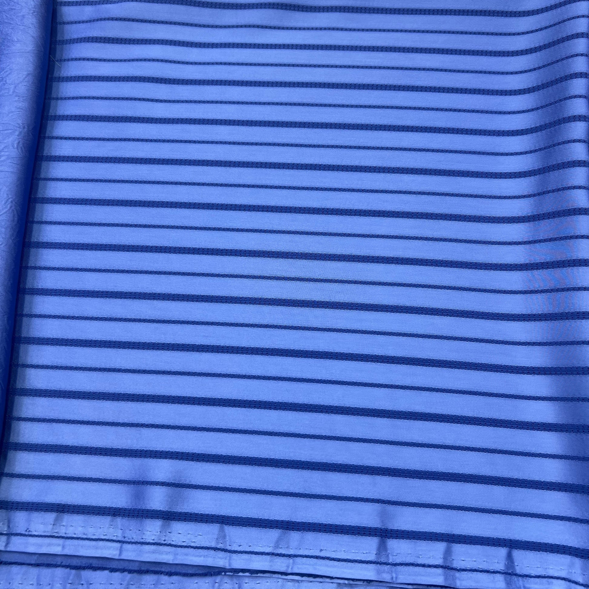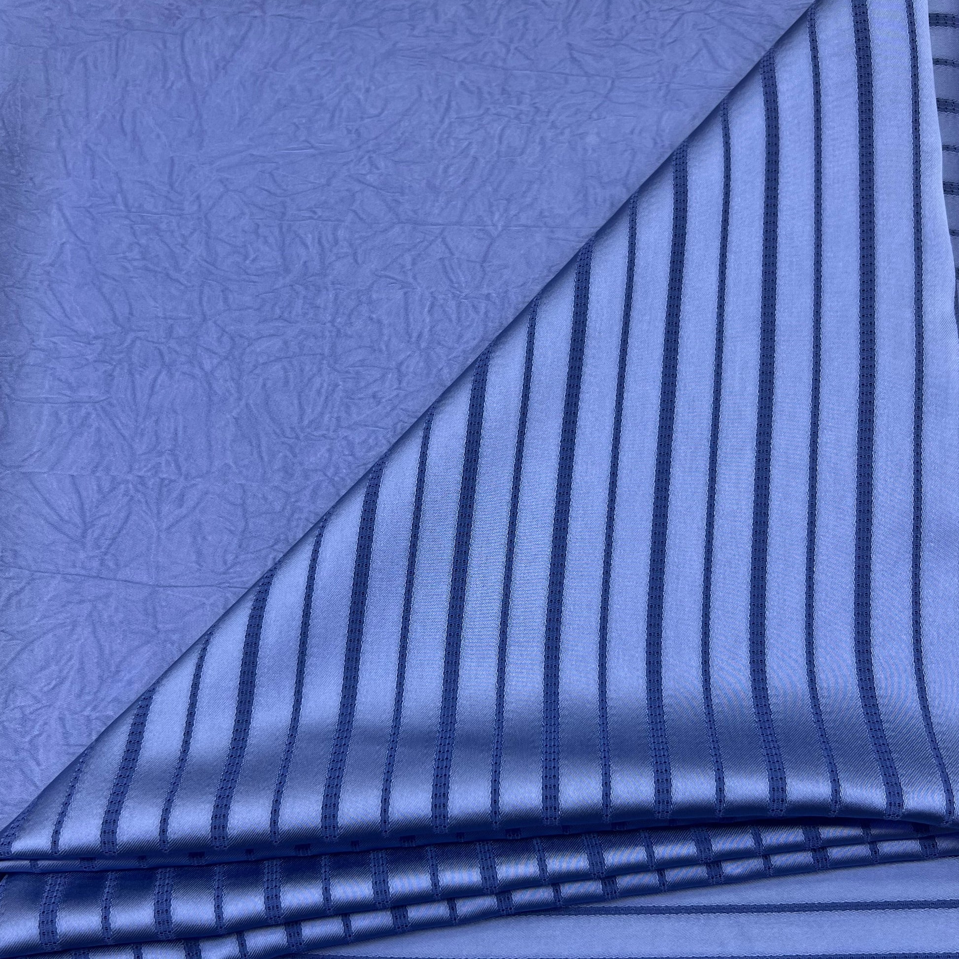 Le tissu offre une texture douce, fluide et légèrement satinée, avec des rayures verticales qui allongent la silhouette et ajoutent une note de sophistication.