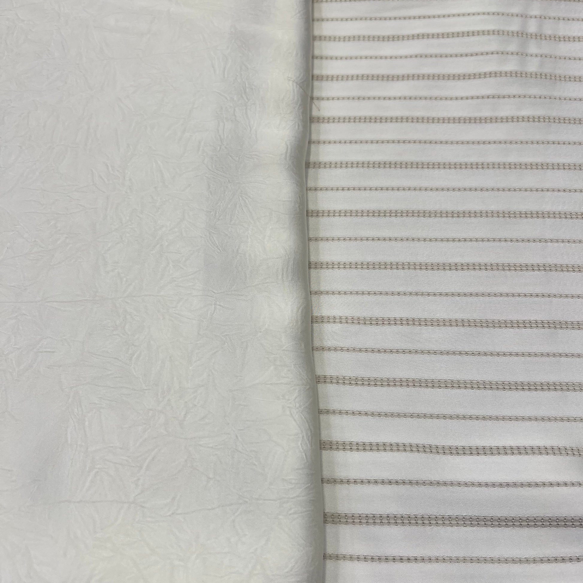 Le tissu offre une texture douce, fluide et légèrement satinée, avec des rayures verticales qui allongent la silhouette et ajoutent une note de sophistication.