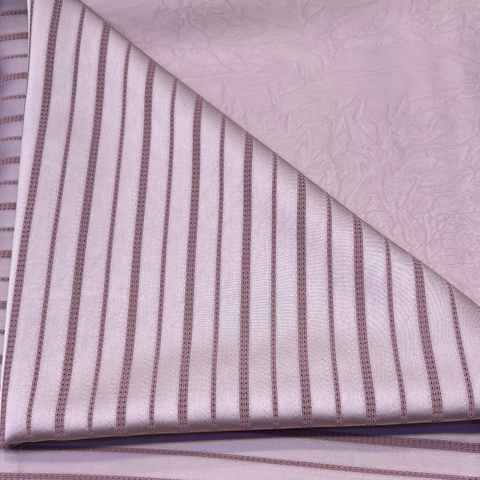Le tissu offre une texture douce, fluide et légèrement satinée, avec des rayures verticales qui allongent la silhouette et ajoutent une note de sophistication.